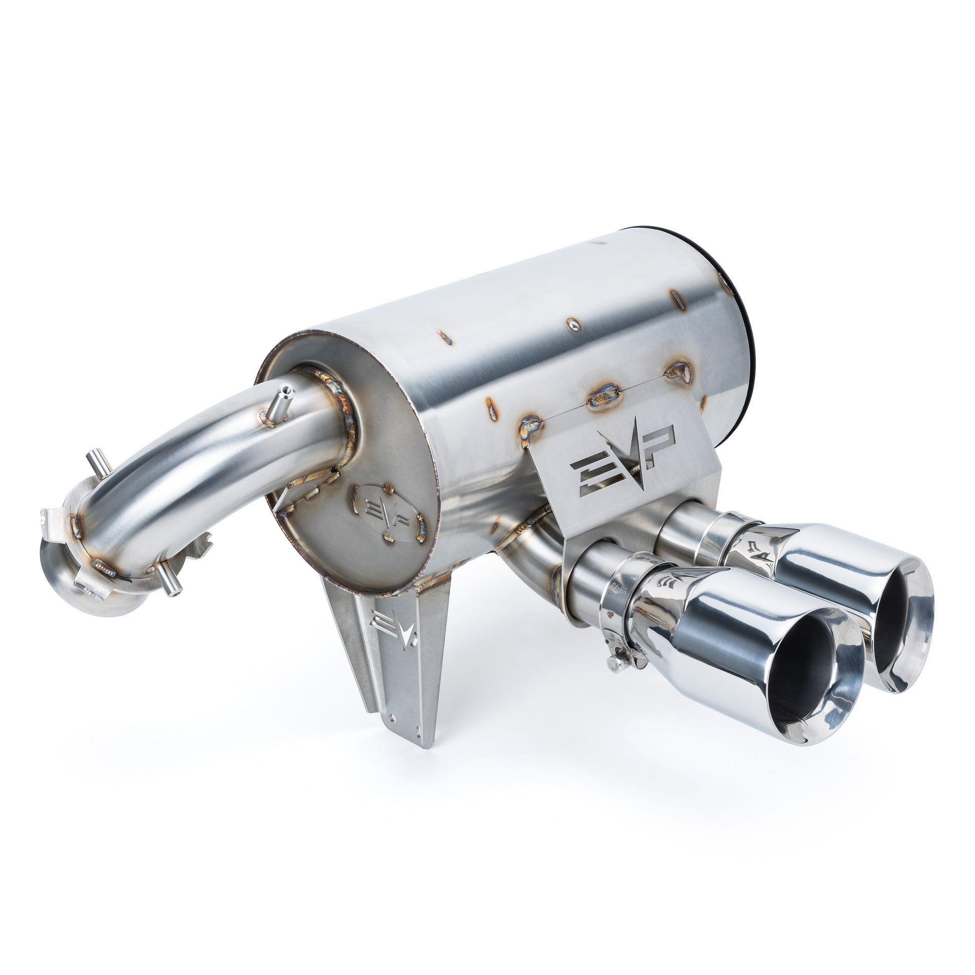 Handmade in limited batches, all EVP Maverick R Dynamic Twin Exit Mufflers come with a serialized production number badge welded onto the canister.