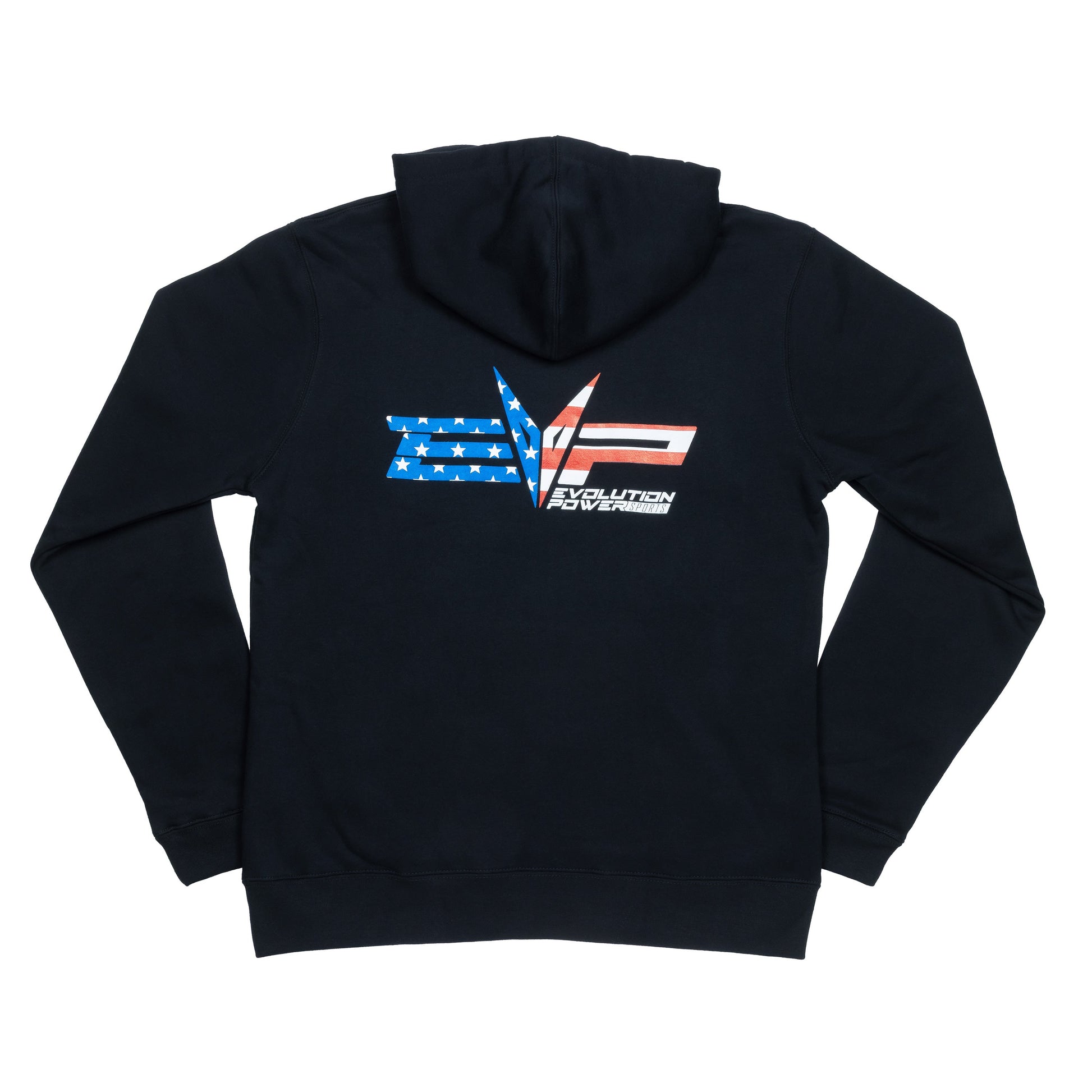 Show off your American Spirit with our EVP Logo Hoodie featuring the American Flag on the front and back of a black hoodie. It is offered in a variety of sizes.